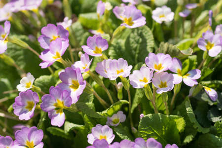 flowers with green leaves in ornamental garden. day light. beautiful natural blooming primula acaulis in spring summer.