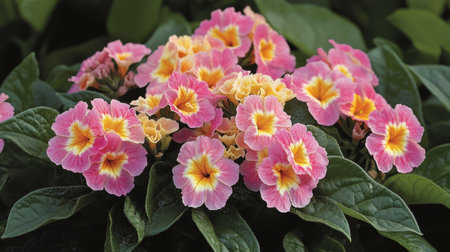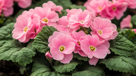 A detailed, close-up shot showcases a vibrant cluster of light pink primrose flowers, surrounded by textured, green leaves, creating a fresh garden aesthetic.