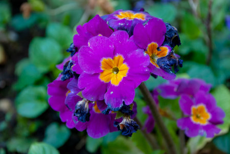 beautiful violet, yellow and purple primula x, pubescens flowers blooming in summer sunshine