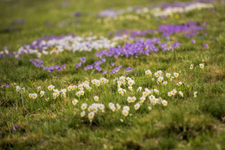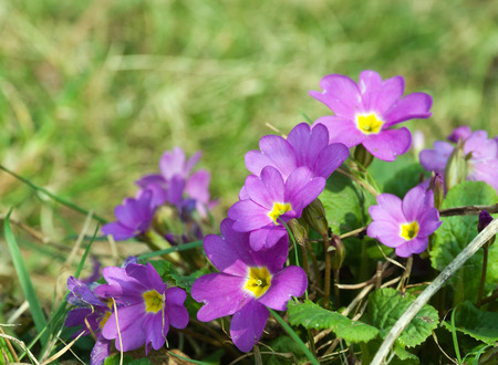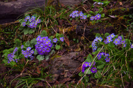 Multicolor Primrose or primula vulgaris first spring flowers in spring garden