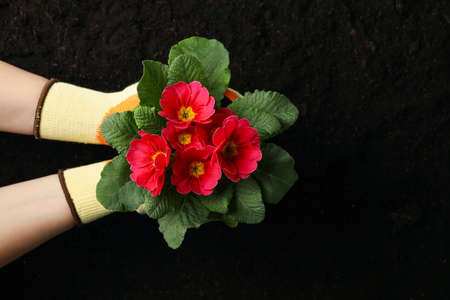 Woman hold pot with flower on soil background, top view