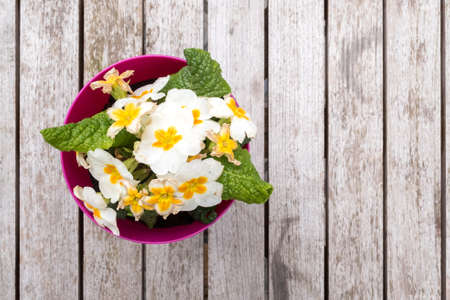 Flowers primrose, primula flowers on wood desk