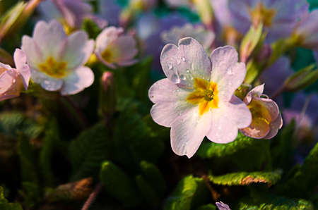 White and yellow primula flowers with dew drops in the spring forest