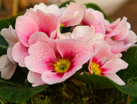 Flowers primula on a wooden table background