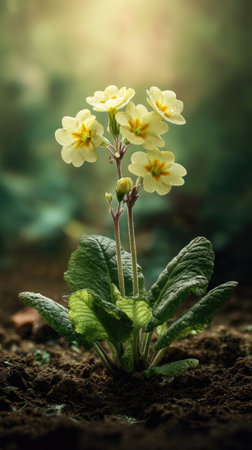 Primrose with small fresh leaves, growing upright in fertile soil, sunlight filtering gently, realistic textures, vibrant green tones, natural photography style, wide balanced composition
