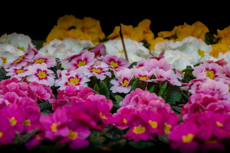 Close-up of vibrant primrose flowers showcasing various colors, adding beauty to a spring garden