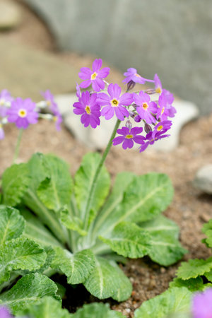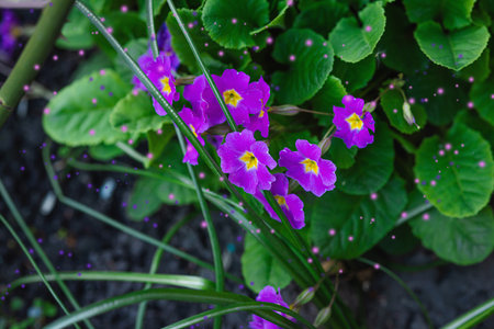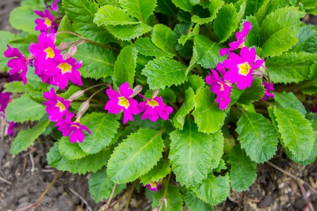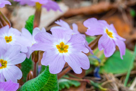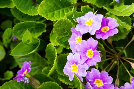 Beautiful violet flowers of primula with juicy green leaves grow in ground close up. Many small purple plants in macro. Background from group of little blooming primroses.