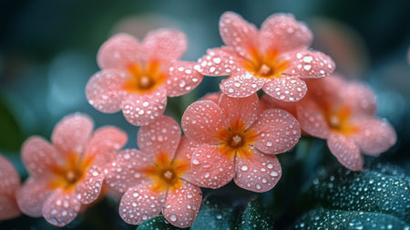 Delicate pink flowers with water droplets enhance the lush green leaves surrounding them. The soft light accentuates the freshness, creating a serene atmosphere in nature.