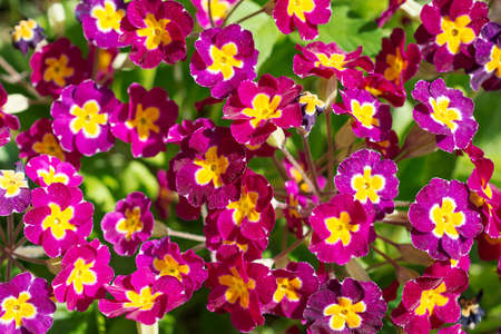 Multicolor primula is a marvellous addition to any garden. Colorful bright primrose flowers floral with green leaves background, Primula Vulgaris. use it as your Copy space, Design, Wallpaper and Poster, Selected focus.