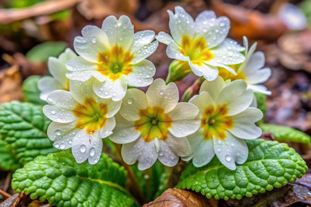 Pretty little wildflowers, Primrose after rain in the garden, close-up. Macro springtime flowers.