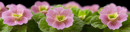 Delicate Pink Primula Flowers, Close-Up on Beauty and Elegance Against a Black Background