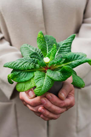 woman holds a green plant in a pot on outstretched arms outdoors, close-up. An elderly man is engaged in floriculture