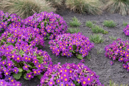 Beautiful violet flowers of primula with juicy green leaves grow in ground close up. Many small purple plants in macro. Background from group of little blooming primroses.