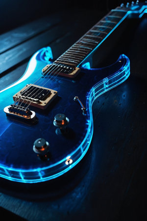Image of a blue electric guitar close-up. The concept of tuning and repairing musical instruments. Mixed media