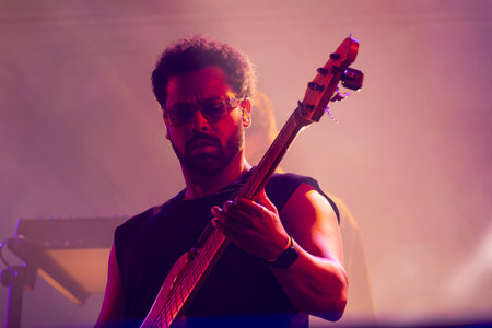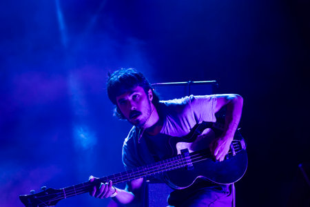 Imperia, Italy - December 4, 2017: A bass player performs live on stage with his electric bass.