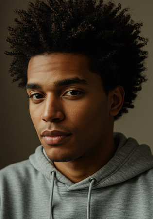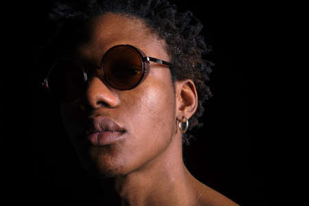 Close up portrait of african american model looks camera. Attractive male with afro hairstyle