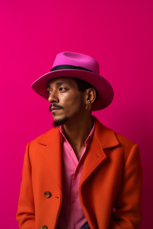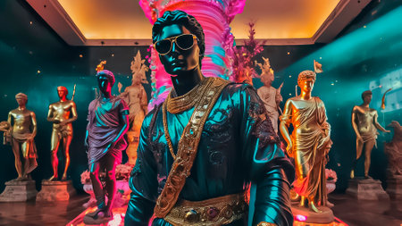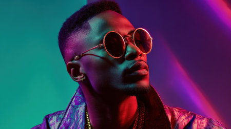 A man poses confidently with sunglasses on, showcasing a fashionable outfit against a backdrop of vivid colors and artistic lighting. The setting reflects a contemporary and creative atmosphere