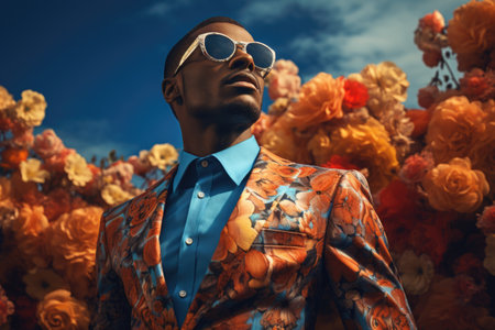 Fashion shot of a man in a suit and sunglasses on a background of flowers.
