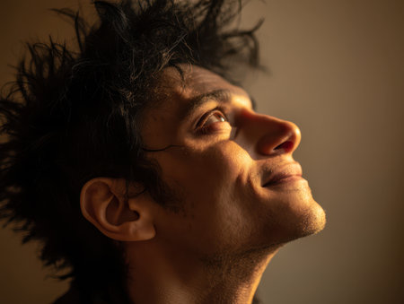 Profile of a person gazing upwards with a serene expression, illuminated by warm lighting. Hair appears tousled, casting shadows on the face. The mood is contemplative and introspective