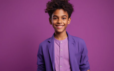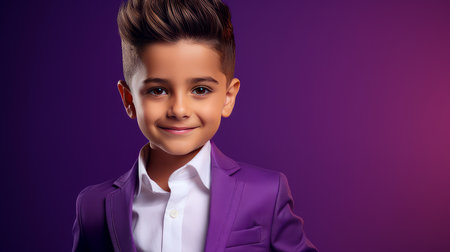 Portrait of a cute happy Hispanic Latino boy child with perfect skin, purple background, banner. Advertising of teenage cosmetics, hair care products, medicines, perfumes, cosmetology, courses, college schools and trainings