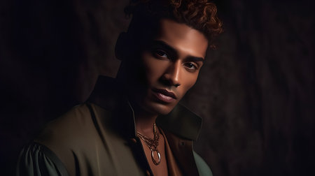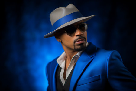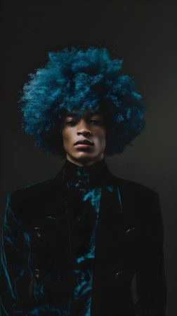 A captivating portrait of a black man with an striking blue afro, dressed in a dark green velvet suit The atmospheric lighting adds an air of mystery and intrigue, perfectly capturing his unique