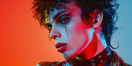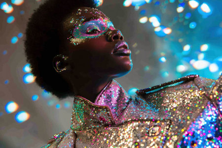 Portrait of a glamorous woman with glittery face makeup against a backdrop of twinkling lights and falling confetti