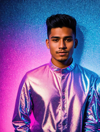 A young man wears a shiny gold jacket and stands confidently in a vibrant, neon-lit space. The colorful lights create a trendy atmosphere, highlighting his modern style.
