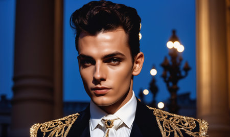 A man in a black velvet suit with gold embellishments stands in front of a building at night, his eyes looking directly at the camera