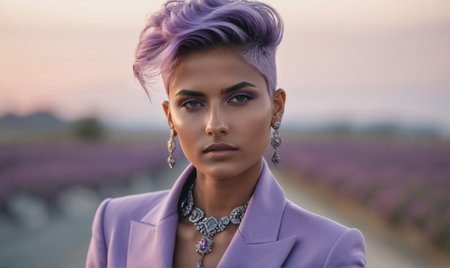 A woman with yellow hair and purple heart-shaped sunglasses poses in a yellow and purple outfit against a purple background