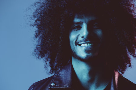 Portrait of fashion man with curly hair on blue background multinational, colored light, black leather jacket trend, modern concept.
