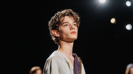 Young model in elegant attire poses confidently on stage during a fashion show at a venue with spotlighted background