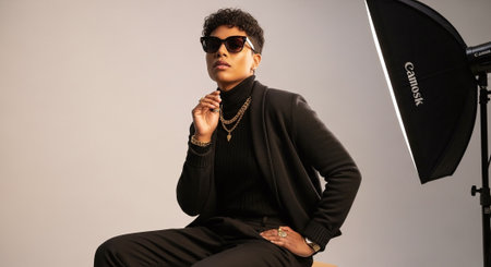 Portrait of a beautiful african american woman in black clothes and sunglasses sitting on a gray background