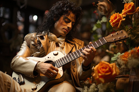 Charismatic rock singer is posing with his guitar at dark photo studio.