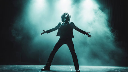 A singer in a dramatic pose on stage with an empty backdrop, offering clear space for adding text or copy.