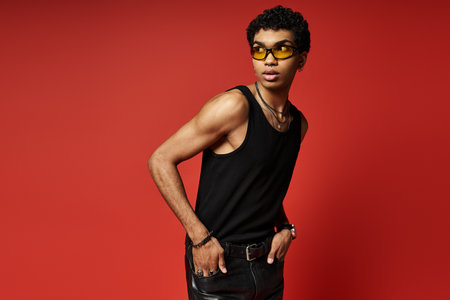 Handsome African American man posing in stylish sunglasses, black tank top, and leather pants.