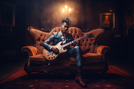 Expressing himself by music Thoughtful young man playing the guitar while lying on sofa : Generative AI