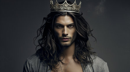 Wise king Handsome man with long hair and beard in crown looking at camera while standing against grey background : Generative AI