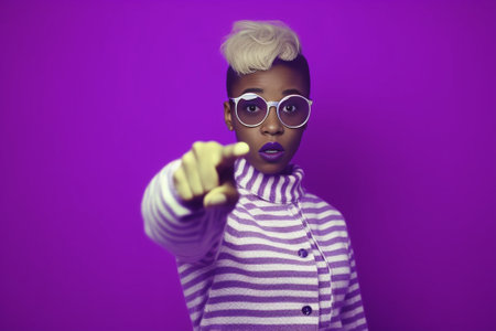 This kiss is for you Lovely affectionate woman with Afro haircut sends air kiss on distance to beloved person wears fashionable clothes gestures against purple wall Body : Generative AI