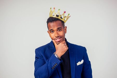 smart african american successful and rich businessman in a stylish suit and the golden crown on his head on white background in studio shot. the concept of well-deserved respect and luck