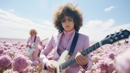 Two musicians with electric guitars in a purple flower field, realistic style, sunny blue sky background, concept of music and nature. Generative AI