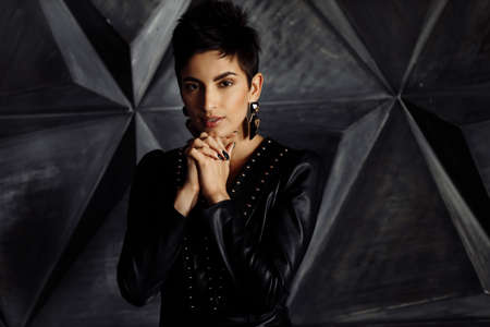 Confident pretty woman owner of the company, looking at the camera. Gorgeous business lady posing at black background, showing success. Beautiful female wearing luxury fashion dress