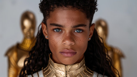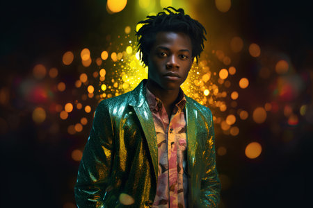 Handsome african american man with afro hairstyle in gold jacket on bokeh background