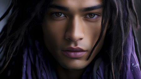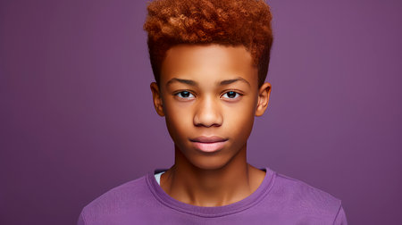 Portrait of a serious troubled African American red-haired teenager guy with perfect skin, purple background, banner. Advertising of teenage cosmetics, hair care products, medicines, perfumes, cosmetology, courses, college schools and trainings