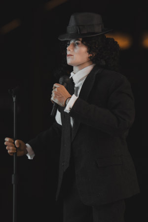 Man musician in stylish hat standing on dark concert stage against purple spotlight and singing in retro microphone, isolated on black studio background.