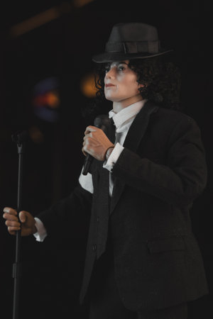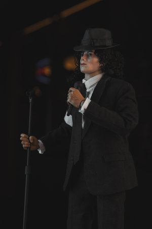 A playful and energetic young man singing a song. With a microphone in hand and a mischievous twinkle in his eye. Talented performer with his infectious energy and hilarious facial expressions.