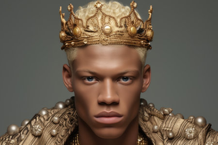 A picture of a man wearing a gold crown and pearls. This image can be used to depict royalty, luxury, or extravagant fashion accessories.