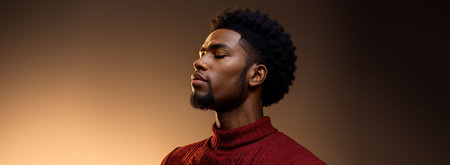 An AI generated illustration of A mature African-American man with a serious expression on his face, wearing a bright red sweater