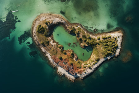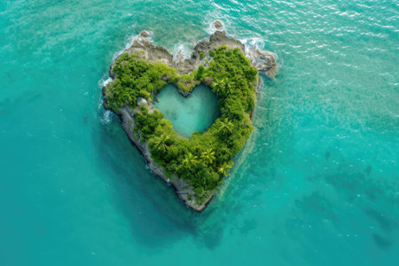 Aerial view capturing a heart shaped tropical island with lush greenery, rocky formations, and a small sandy beach, surrounded by vibrant turquoise waters