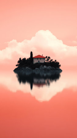 A serene sunset casts a gentle pink hue over a small island featuring a lone house surrounded by still waters. Lush greenery and clouds reflect beautifully on the surface.