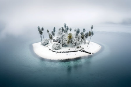 An AI generated illustration of an idyllic tropical island featuring snow-dusted trees and tranquil azure waters